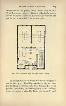 The branch library at West Norwood occupies a 80 feet by 50. It will be seen from Fig. 104 that the building is divided into two halves, the front portion containing tin- lending library and reading-room for women, while the back portion is divided