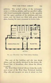 The West Ham Central Library forms the north-west corner of the West Ham Technical Institute (Fig. 108), and occupies an area of about 115 feet