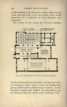 and the lending library book-store can have two tiers of bookcases, each 7 feet 6 inches in height, thus giving shelf-room for about 60,000 volumes. In the basement underneath, further accommodation can be obtained when the whole of the shelving is full.