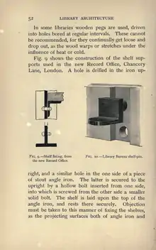 In some libraries wooden pegs are used, driven into holes bored at regular intervals. These cannot be recommended, for they continually get loose and drop out, as the wood warps or stretches under the influence of heat or cold. Fig. 9 shows the construction of the shelf supports used in the new Record Office, Chancery Lane, London. A hole is drilled in the iron up