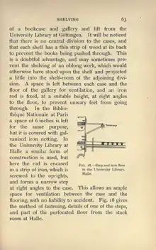 of a bookcase and gallery and lift from the University Library at Göttingen. It will be noticed that there is no central division to the cases, and that each shelf has a thin strip of wood at its back to prevent the books being pushed through. This is;i doubtful advantage, and may sometimes prevent the shelving of an oblong work, which would otherwise have stood upon the shelf and projected a little into the shelf-room of the adjoining division. A space is left between each case and the floor of the gallery for ventilation, and an iron rod is fixed, at a suitable height, at right angles to the floor, to prevent unwary feet from going through. In the Bibliothèque Nationale at Paris