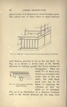 newspapers. They are small V's of sheet iron, which are screwed to the underside of the top shelf; but with these great care has to be taken in replacing the volumes, or they are liable to be damaged. Fig. 23 is an illustration of a skeleton bookcase used in the British Museum for the large folio