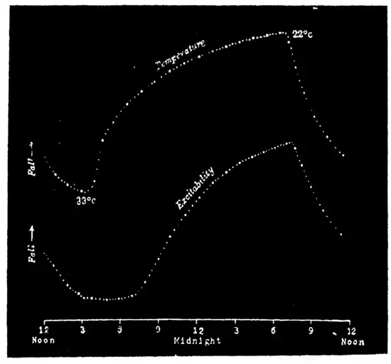 the leaf at any particular moment. In the lower curve of Fig. 5 is given the record of diurnal variation of excitability of Mimosa. Comparison of this figure with Figs. 3 and 4, will show the remarkable resemblance between the curves of diurnal movement of the Palm tree, and of diurnal variation of moto-excitability of Mimosa. The excitability of Mimosa reached its maximum at about 3