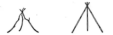 We reached the lake at noon and it seemed as if we might soon have time to sit down and rest. But there was a great deal to do. Aggie was of no assistance on account of her arms, so Tish and I put up the tent. The "Young Woodsman" said it was easy. First you tied three long poles together near the top and stood them up so they made a sort of triangle. Then you cut about a dozen and filled in between the three. That looked easy, but it took an afternoon, and our first three looked like this first cut.