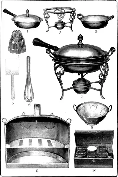 1. Chafing Dish Pan. 2. Chafing Dish Stand and Lamp 3. Double Boiler of Chafing Dish. 4. Jelly Mould. 5. Meat Slice. 6. Whisk. 7. Chafing Dish complete. 8. Colander. 9. Dutch Oven. 10. Spice Box.
