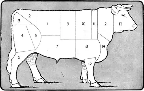 1. Sirloin. 2. Rump. 3. Aitchbone. 4. Buttock. 5. Leg. 6. Flank. 7. Thin Flank. 8. Brisket. 9. Prime Rib. 10. Middle Rib. 11. Chuck and Leg-of-Mutton Piece. 12. Neck. 13. Head. 14. Clod. 15. Shin.