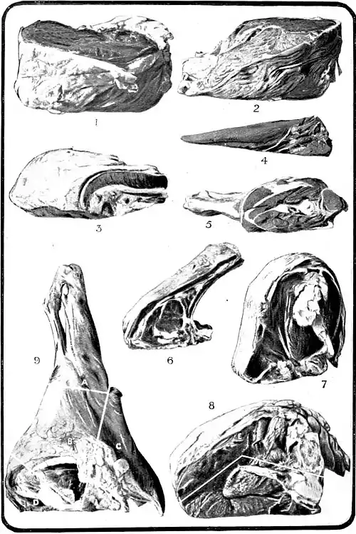 1. Round. 2. Aitchbone. 3. Brisket. 4. Tongue 5. Leg. 6. Ribs. 7. Sirloin. 8. Buttock: e. Topside or Buttock; f. Silverside or Round. 9. Hind-quarter: a. Leg. b. Buttock. c. Thick Flank. d. Aitchbone.
