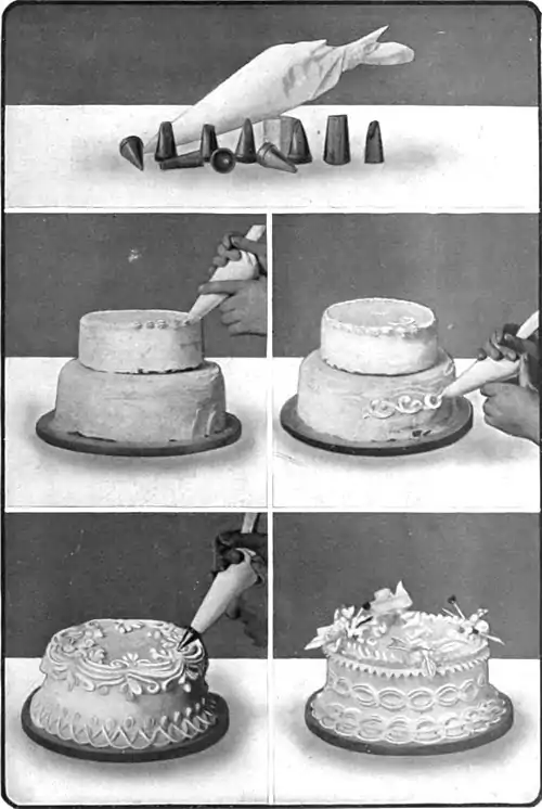 Make an ordinary grocer's paper bag, place one of the piping funnels at the bottom, pour the prepared sugar into the bag, and tear the paper off the point of it. Hold the bag in the right hand, and with the fingers of the left squeeze the sugar through the funnel. The piping tubes have teeth, and patterns of piping vary according to the "outlet."