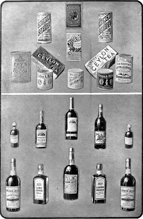 1. Coffee Cadbury's Cocoa, French Coffee, Vi-Cocoa, Fry's Cocoa Ceylon Tea, Coffee and Milk, Nestlé's Milk, Ceylon Tea, Cocoa and Milk, Van Houten's Cocoa. 2. Essence of Vanilla, Calves' Feet Jelly, Table Jelly, Maple Syrup, Essence of Cochineal, Orange Jelly, Lime Juice Cordial, Lemon Jelly, Lemon Squash, Lemon Jelly.