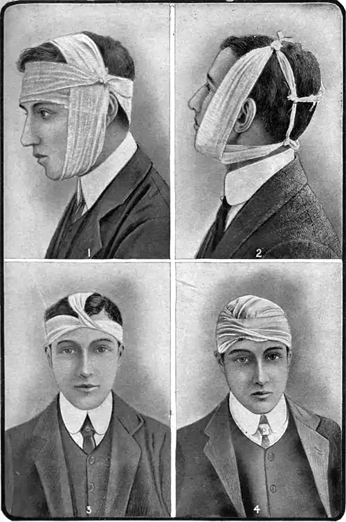 1. Bandage for pressure in region of the temple. 2. Application of Four-tailed Bandage for fracture of lower jaw. 3. To commence a Capeline Bandage. 4. Capeline Bandage complete.