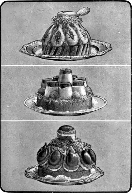 1. Chaud-froid of Lamb Cutlets. 2. Chicken Timbales, in Aspic. 3. Stuffed Larks, in Cases.