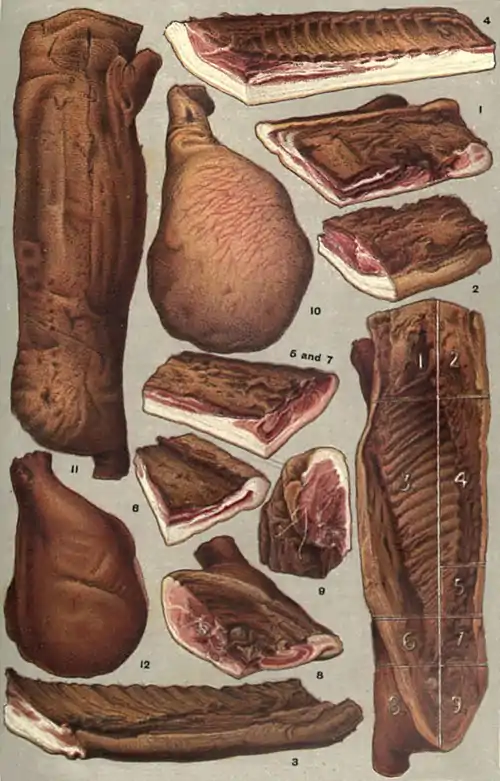 Side of Bacon. 1. Forelock. 2. Collar. 3. Streaky. 4. Prime Back. 5. Small Back. 6. Flank. 7. Long Back. 8. Gammon. 9. Corner. 10. York Ham. 11. Side of Bacon. 12. Mild Cured Ham.