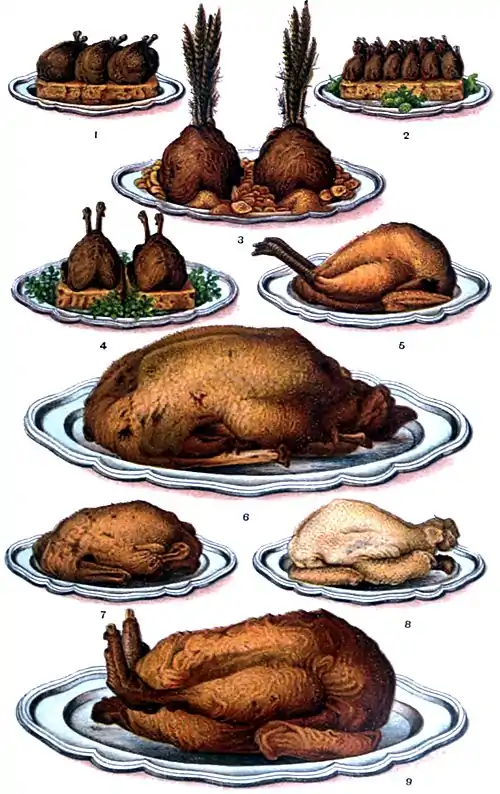 1.—Snipe on Toast. 2.—Larks on Toast. 3.—Roast Pheasant. 4.—Roast Pigeons. 5.—Roast Fowl. 6.—Roast Goose. 7.—Roast Duck. 8.—Boiled Fowl. 9.—Roast Turkey.