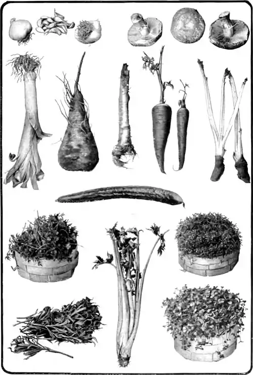 Shallots, Mushrooms, Leek, Parsnip, Horse-radish, Carrots, Sea-kale, Cucumber, Sorrel, Tarragon, Celery, Mustard, Cress.