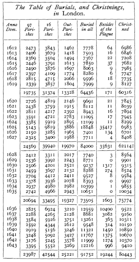- ↑ increase of 24; Wiseman to Pennington, 7 October: "The sickness is increased by 24 this week, there being dead of all diseases 650 persons [perhaps intended as a round figure], whereof 239 of the plague." Ibid., 134, Pennington's correspondents, therefore, substantially confirm Bell's figures for four weeks. If his figures for the remaining weeks of 1641 are equally accurate, Graunt's figures for that year must be far too small.