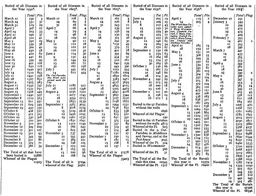 A Table[1] shewing how many died weekly, as well of all Diseases, as of the Plague, in the Years 1592, 1603, 1625, 1630, 1636; and this present Year 1665.
