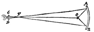 I have sometimes thought to make a Microscope, which in like manner should have, instead of an Object-glass, a Reflecting piece of metall. And this I hope they will also take into consideration. For those Instruments seem as capable of improvement as Telescopes, and perhaps more, because but one reflective piece of metall is requisite in them, as you may perceive by the annexed diagram, where A B representeth the object metall, C D the eye glass, F their common Focus, and O the other focus of the metall, in which the object is placed.
