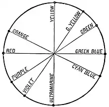 Fig. 10.—Chromatic Circle. be found that alterations in color produced by contrast obey a very simple law: when any two colors of the chromatic circle are brought into competition or contrasted, the effect produced is, apparently, to move them both farther apart. In the case, for example, of orange and yellow, the orange is moved toward the red, and assumes the appearance of reddish-orange; the yellow moves toward the green, and appears for the time to be greenish-yellow. Colors which are complementary are already as far apart in the chromatic circle as possible, hence they are not changed in hue, but merely appear more brilliant and saturated. This is indeed the effect which a strict application of our rule