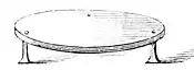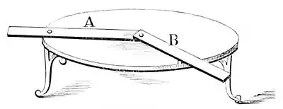 A being the stationary arm, and B the movable arm. Make the small disk of wood also into a table (see Fig. 4) by fastening in three sharp—feet screws will do. Place this smaller table centrally on the larger