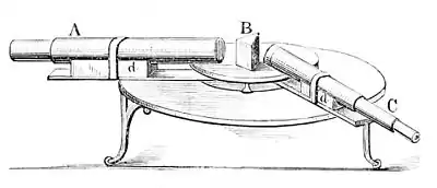 each other, and (2) with the prism. The instrument is then complete (see Fig. 5), where A is the collimator, B the prism, and C the telescope.
