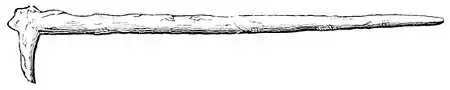 Fig. 2.—"Tima," or Maori Hoe. "hackers," and within a generation there was still to he seen in use on forest farms the "hack" itself (Fig, 3), made of a stake of spruce-fir, with, at the lower end, a stout projecting branch cut short and pointed (Hyltén-Cavallius, "Wärend och Wirdarne," part ii, p. 110; i, p. 43). Even among native tribes of America a more artificial hoe than this was found in use. Thus the hoe used by the North American women in preparing the soil for planting maize, after the old stalks had been burned, is described as a bent piece of wood, three fingers wide, fixed to a long handle (see Charlevoix, "Nouvelle France," Letter 23; Lafitau, "Mœurs des Sauvages Ameriquains," vol. ii, p. 76, and Plate 7). (I do not venture to copy the hoe shown in this plate: a mere fancy picture.) In other North American tribes the women hoed with a shoulder-blade of an elk or buffalo, or a piece of the shell of a tortoise fixed to a straight handle (see Loskiel, "Mission of the United Brethren in North America," p. 66; Catlin, "American Indians," vol. i, p. 121). From this stage we come up to implements with metal