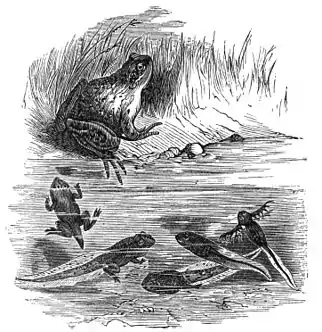 progress from the germ to the adult stage present themselves to view as simply meaningless facts and useless freaks and vagaries of Nature. Accepting the idea—favored, one may add, by every circumstance of life-science—much that was before wholly inexplicable becomes plain and readily understood. And the view that a living being's development is really a quick and often abbreviated summary of its evolution and descent both receives support from and gives countenance to the general conclusion that life's forces tend as a rule toward progress, but likewise exhibit retrogression and degeneration. If a living being is found to begin its history, as all animals and plants commence their existence, as a speck of living jelly, comparable to the animalcule of the pool, it is a fair and logical inference that the organisms in question have descended from lowly beings, whose simplicity of structure is repeated in the primitive nature of the germ. If, to quote another illustration, the placid frog of to-day, after passing through its merely protoplasmic stage, appears before us in the likeness of a gill-breathing fish (Fig. 1), the assumption is plain and warrantable that the frog