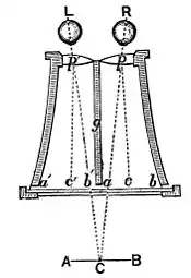 Fig. 13.—Theory of Visual Triangulation. relation between this and an object to be pictured, and the admirable mathematical discussion which Helmholtz gives subsequently in full is strictly applicable. But, if the observer's eyes be too near together, or the stereographic interval be too great, the relation between the visual lines ceases to be the same as that between the camera axes, and we no longer have the conditions under which the geometric discussion can be applied. It is but due to Helmholtz to add that he closes with the following remark: "These conditions are not generally fulfilled for the photographic proofs and the stereoscopes of commerce." The same credit can not be given to the writers of the ordinary text-books. This qualification is of the last importance, for without it the theory is absurd, the apparent position of the image determined by intersection of visual lines being behind the observers head when optic divergence is induced, and at an infinite distance when they are parallel. But, even when camera axes and visual lines bear the same relation among themselves, the abnormal muscular condition necessitated in stereoscopic vision introduces a disturbing element. The theory is hence not applicable at all to the stereoscope, but must be limited to the discussion of the binocular camera.