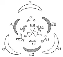 Fig. 1.—a. ovaries; b, stamens, inner whorl; c, stamens, outer whorl; d, petals; e, calyx-pieces. we may say that the alismas and the buttercups really stand very close to one another in the order of development. When the two main branches of flowering plants first diverged from one another, the earliest petal-bearing form they produced on one divergent branch was the alisma, or something very like it; the earliest petal-bearing form they produced on the other divergent branch was the buttercup, or something very like it. Hence, whenever we have to deal with the pedigree of either great line, the fixed historical point from which we must needs set out must always be the typical alismas or the typical buttercups. The accompanying diagram will show at once the relation of parts in the simplest trinary flowers, and will serve for comparison at a later stage of our argument with the arrangement of their degraded descendants, the wheats and grasses.