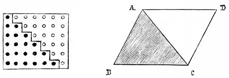 to any number; so the sum of the first hundred numbers is half of a hundred times a hundred and one, or 5,050. Therefore, to obtain the sum of all the numbers of any series beginning with unity, all that is necessary is to take half the product of the last number of the series by the next one. An analogue of this mode of reasoning appears in the geometrical demonstration of the proposition that the area of the triangle ABC (Fig. 2) is half that of the parallelogram A B C D, of the same base and height; and reflection will show us that the arithmetical and the geometrical theorems are really one. The numbers we have just learned to calculate, which represent all collections of objects regularly disposed in triangles, are called triangular numbers. The