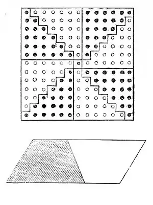 Fig. 4. essential condition of such a number, that the octuple of a triangular number, augmented by unity, is a perfect square. This fact is made evident by the examination of the diagram (Fig. 3). An arithmetical progression is a series of numbers in which each member is equal to the preceding member, plus a constant number which is denominated the common difference. Thus the odd numbers one, three, five, seven, nine, eleven, form an arithmetical progression, the common difference of which is two. We can demonstrate, as was done in the preceding case, that the sum of the terms in such a procession is equal to the product of the number of terms by the half-sum of the extremes; and, in the same way, the area of a trapeze is half the area of a parallelogram of the same height, the base