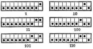 Instead of increasing the height of our abacus by two squares to explain the duodecimal system, let us put in its place a rectangle two squares high and of any desired width. We shall then have the system of binary numeration, and be able to write all the numbers with only two figures, and 1. The numbers one, two, three, four, five,