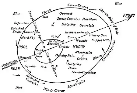 We will now take the cyclone separately, and detail the kind of wind and weather which is experienced in different parts of it. In Fig. 2 we give a diagram on which we have written in words the