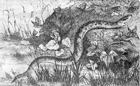 In temperate climates serpents as a rule are less fierce than in the tropics. In North America the Crotalidœ comprise twelve species with rattles, and three species in which rattles are absent. Of the last named, the copperhead and moccasin snakes are well known. Of the first, the northern rattlesnake (Fig. 7) is familiar, and unpleasantly abundant in many parts of the country, but is nowhere fierce or inclined to attack. Fig. 8 is of the common viper, or adder of England and the Continent.
