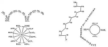 Fig. 11 shows the number form of a girl of nine years. This is a colored form, its peculiarity consisting in the fact that the numbers containing two or more figures maintain their individuality and appear in a color formed by mixing the colors of its constituent digits. Thus 13 is not white and pink but pale pink. Other colored or partly colored forms appear in Figs. 17 and 18. In the former, 5 is scarlet, while the other numbers are not seen in colors. This form, like that in Fig. 4, lies in space of three dimensions, and like that of Fig. 10 has some faint and some missing numbers. Other peculiarities of this form are best presented in the words of the seer herself:
