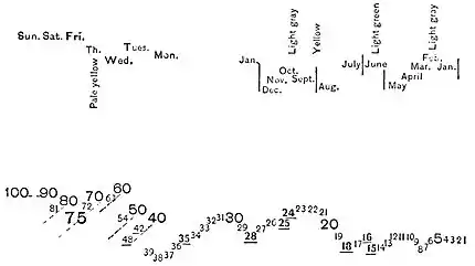 individuality further by clothing it in a particular color, or even personifying it outright as in the two cases given. Color audition and association of color with written characters are explained by many as due to physiological conditions, especially to the contiguity of the cortical center involved. Dr. Krohn, in a recent review of the subject in the American Journal of Psychology, adopts this explanation in part. It is doubtful whether this hypothesis is necessary to explain the comparatively rare cases of color associations; it certainly is not necessary for explaining number forms. In any case, physiological association would be due, either in its origin or as a justification of its survival, to useful psychic associations. Now, in the matter of number forms, suppose