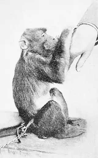 Mimi pleased Bob from the first, though he was careful never to let her forget her proper station. If, for example, she had any food he wanted, or if others showed her special attention, he would seize her chain, draw her up to him, and bite her forcibly in the neck, which is the time-honored sign of domestic supremacy in Borneo. At this she would squeal lustily, but she never offered resistance or showed any kind of resentment. Masculine supremacy is acknowledged in the tribe of Macacus as in that of