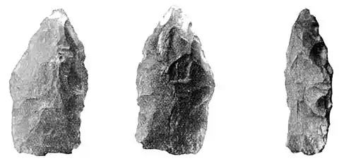 upon its cutting edge; and, what is of special significance, that it had been sharpened not by the more modern processes, described by the speaker in a previous paper, in which the chips were broken from the edge by pressing against it with a piece of bone, but by the older process of striking against the edge with another stone. The type of the implement also was pronounced by Mr. Gushing to be the earliest known, although from the convenience of the form it has always continued in use. It was one, however, which appeared at the very dawn of human development.