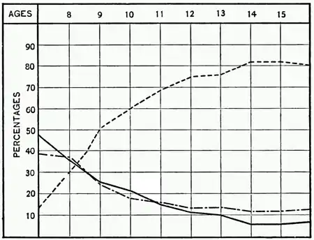 As might be expected, the younger children pay little attention to the outside world. At seven years of age forty-seven per cent of the children find their ideals in father or mother, in neighbor or friend, thirty-nine per cent in literature, and fourteen per cent in history.