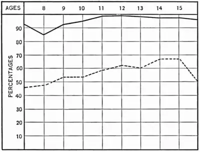 As shown by Chart III, as many as sixty-seven per cent of the girls of fourteen and fifteen select male ideals. To be sure, there are