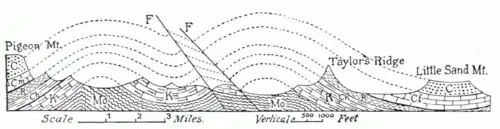 Fig. 3.—Cross-section of a complex valley in the southern Appalachians, showing it to be independent of the geological structure, which is represented by the shading. Dotted lines mark what was the upper limit of strata which Lave been denuded away. The straight lines (F) illustrate some of the faults affecting the region.