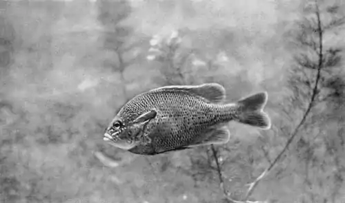 Fig. 3.—Long-eared sunfish (Lepomis auritus). One third natural size from life. Reproduced from a photograph taken by Dr. Schufeldt at the United States Aquaria at Washington. D.C.
