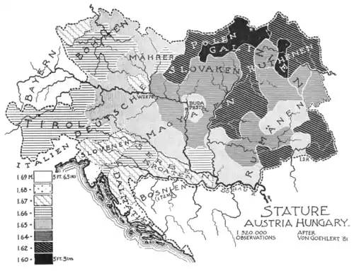 - ↑ Note.—This map seems to give average statures slightly lower than those of other observers, like Weisbach, Korösi, and Janko; but, on the other hand, they are corroborated by Scheiber, Majer and Kopernicky, and Zuckerhandl. In all cases the relativity of the various districts is precisely the same; it is confirmed by the maps for the empire by Le Monnier and Mvrdacz. It seems to fit perfectly the results for neighboring countries, given by Livi, Zakrezewski, and Anutchin.