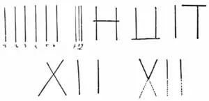 eight. To make the demonstration, we have only to group the nine match-sticks as in the figure (Fig. 9) below. We might demonstrate in a like way that half of twelve is seven by cutting the Roman numeral XII in two, leaving the upper part visible. Such pleasantries have a pedagogical value, because the paradox is precisely