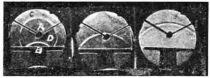 sphere, the center of which lies as far below the reflecting surface as the point at which the sound originates is above it. In the case of light, this point constitutes the image in the mirror. Referring to the photograph, we see the reflected wave in three successive positions, the interval between the sound spark and the illuminating spark having been progressively increased. The brass balls are shown at A, and beneath them the flat plate B, which acts as a reflector. In the first picture the sound wave C appears as a circle of light and shade, and has just intersected the plate. The echo appears at D. In the next two pictures the original wave has passed out of the field, and there remains only the echo.