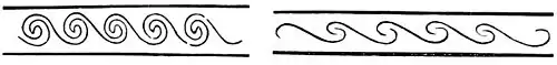 Some have claimed that this last ornament was originally emblematic of water. This was certainly not the case, and it never came to mean water until, having fully grown, it was recognized as resembling the curling waves of the sea. In Etruscan art we frequently find a series of little dolphins gracefully leaping over the crests, or fishes are drawn in below. Here, undoubtedly, the ornament was treated as representing water, or the sea. A host of beautiful borders grew up by combining two or more series of these scrolls and shading the spaces in various ways, but I have not time to speak of them here.