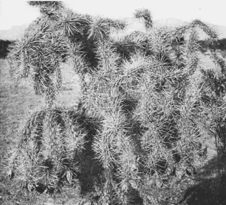The cholla is perfectly adapted not only for the easy detachment of the ends of the branches, but for their wide dissemination as well. The fruit which hangs from the tree in long, pendulous clusters as illustrated in Fig. 6 is within easy reach of cattle and other large animals.