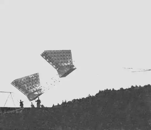 Fig. 2. Giant Kite built of Triangular Cells. The superstructure consists of seventy kites, like the one in Fig. 1, tied together at the corners and arranged in two sets of thirty-five kites each. Each of these kites was tested individually before being combined and found to fly well by itself. There are a total of 840 triangular cells in the giant kite. The total length of the kite is 29.5 feet. The picture shows the kite rising into the air.