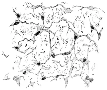 Every cell is a unit both anatomically and physiologically. It has a certain individuality of its own. In many cases cells are found to be isolated or separated completely from one another. But, on the other hand, we also find numerous instances in which the living substance of one cell is directly continuous with that of another. When the cells are thus related, we speak of the union of cells as syncytium. Of this I offer you an illustration in the second picture upon the screen which represents the embryonic connective tissue of man. In this you can see the prolongations of the protoplasm of a single cell body uniting with the similar prolongations from other cell bodies, the cells themselves thus forming, as it were, a continuous network with broad meshes between the connecting threads of protoplasm. The spaces or meshes are, however, not entirely vacant, but contain fine lines which correspond to the existence of fibrils, which are characteristic of connective tissue and at the stage of development represented in this picture, are beginning to appear. It is fibrils of this sort which we find as the main elements in the constitution of sinews and tendons, as, for instance, the tendon of Achilles, at the heel. In a very young body we find there are but few fibrils; in the adult body an immense number.