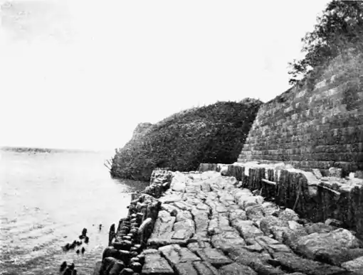 The Haining Pagoda, which has been mentioned already, is apparently not very old and was probably built by a Buddhistic believer in fung shui as a protection to the bund and the city against the ravages of the "serpent's head." It is a fair specimen of its class, and certainly forms the most prominent eminence on that section of the wall, and, together with the more recently constructed pavilion just below it, serves well to mark a vantage point from which to view the approach and passage of the wonderful wave which sweeps past at every tide.