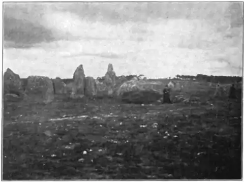 which states that it was struck by lightning, overthrown and broken in the sixteenth century. There is apparently little doubt that once this immense stone stood vertically, but the engineering problem of its erection is not easily solved. One can hardly believe, with Le Rouzic, that the lever and inclined plane were sufficient; yet what other mechanical aids could have been available?